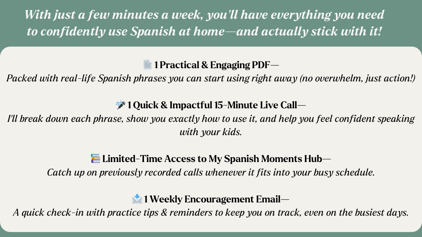 It’s a low-commitment, high-impact membership designed to help busy parents speak Spanish naturally with their kids—without feeling overwhelmed. Each week, you’ll receive a simple phrase, a short live breakdown call, and resources to help you stay consistent.