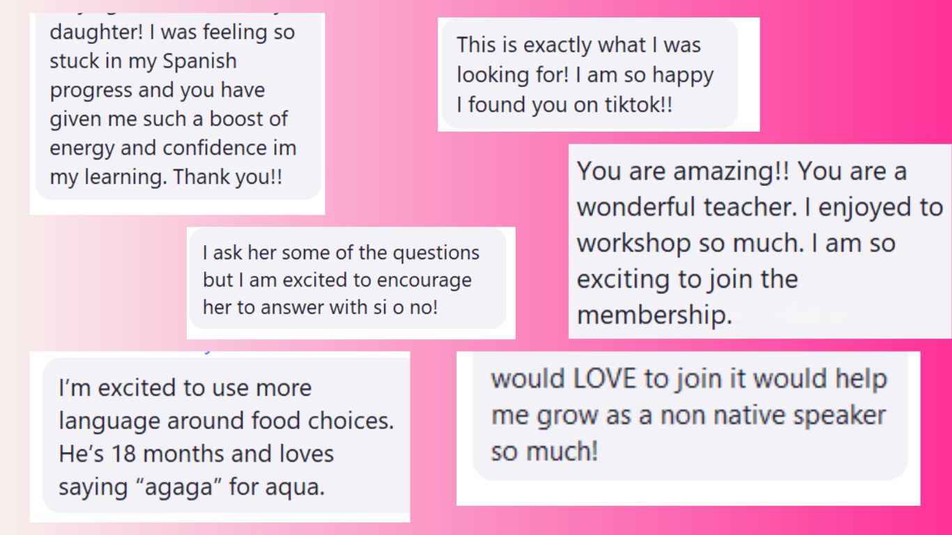 The framework I provide you in Bilingual Bonds: A Parent's Workshop to Spanish Conversations helps you bring Spanish in your home in a way that takes away the STRESS and THINKING that you just don’t have the energy for. By simply using these types of questions to your child, you instantly go from THINKING about speaking Spanish to ACTUALLY speaking Spanish will create your bilingual home with ease.